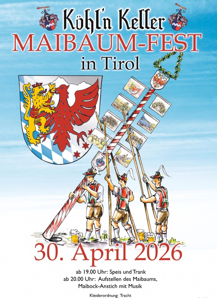 Maibaumfest im Köhlnkeller. Ab 19.00 gibts zum Essen und zum Trinken und um 20.00 wird der Baum aufgestellt. Musik gibts auch und Tracht ist Pflicht.