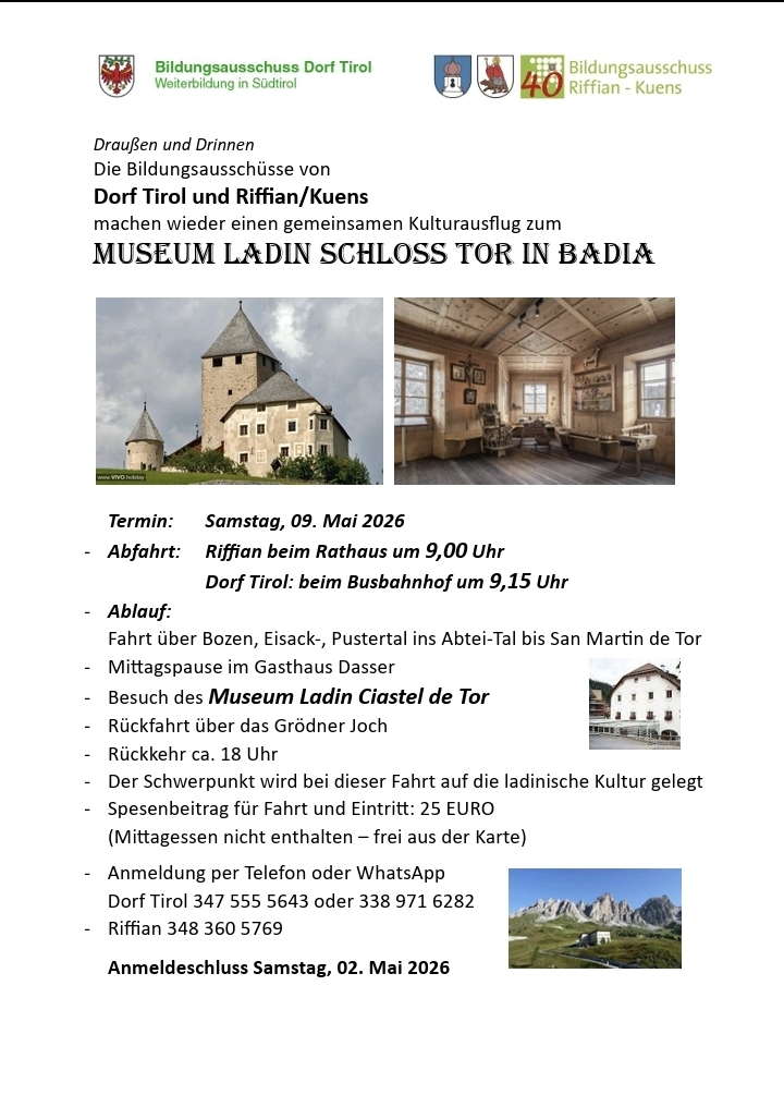 Kulturfahr zum MUSEUM LADIN in BADIA Der Bildungsausschuss von DORF TIROL und von RIFFIAN/KUENS unternehmen dieses Jahr eine Fahrt ins Ladinische. Termin: Samstag, 09. Mai 2026 Abfahrt: Riffian beim Rathaus um 09,00 Uhr Dorf Tirol: beim Busbahnhof um 09,15 Uhr Ablauf: Fahrt über Bozen, Eisacktal, Pustertal ins Abteital bis San Martin de Tor Mittagspause im […]
