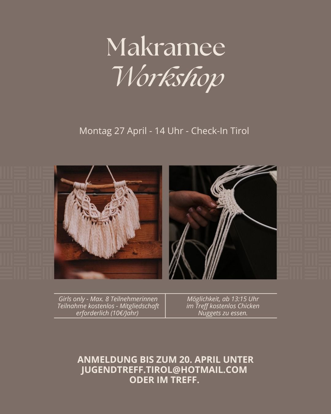 Makramee-Workshop. Max 8 Teilnehmer. Girls only. Nur für Mitglieder. Anmeldung unter: Jugendtreff.Tirol@Hotmail.com